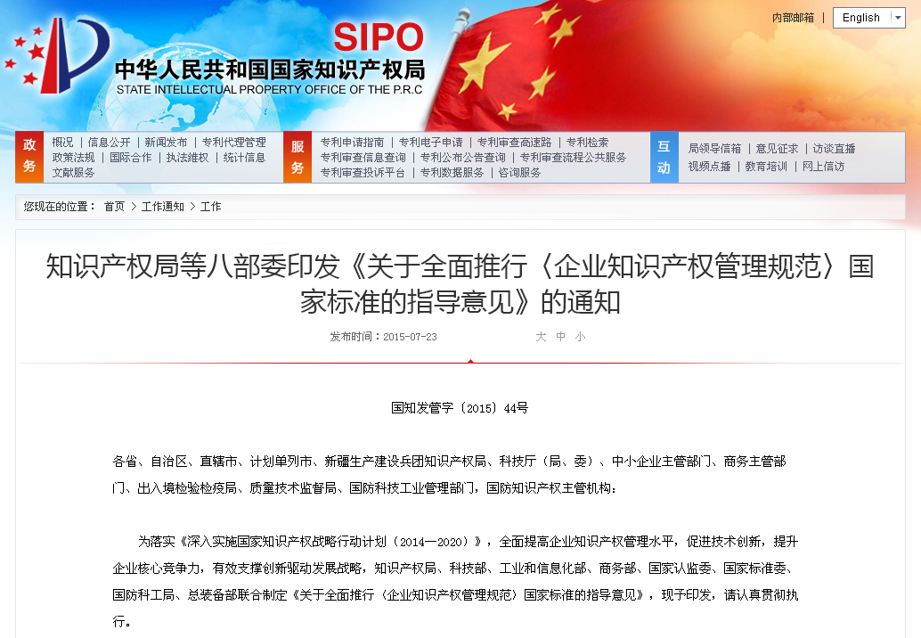“貫標(biāo)”對(duì)于企業(yè)來(lái)說(shuō),就是貫徹《企業(yè)知識(shí)產(chǎn)權(quán)管理規(guī)范》國(guó)家標(biāo)準(zhǔn)。企業(yè)知識(shí)產(chǎn)權(quán)管理規(guī)范的國(guó)家標(biāo)準(zhǔn)由國(guó)家知識(shí)產(chǎn)權(quán)局制訂,經(jīng)由國(guó)家質(zhì)量監(jiān)督檢驗(yàn)檢疫總局、國(guó)家標(biāo)準(zhǔn)化管理委員會(huì)批準(zhǔn)頒布,于2013年3月1日起實(shí)施,標(biāo)準(zhǔn)號(hào)是GB/T29490-2013。目前,全國(guó)各地都在陸續(xù)推行這一標(biāo)準(zhǔn)。